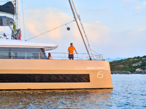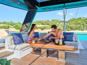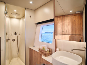 Saideira is a luxurious Moon 60 Catamaran, launched in 2025, with 4 double cabins, each equipped with en-suite bathroom and air conditioning. The spacious saloon has front and rear doors, creating a seamless indoor/outdoor experience. With the galley up you can interact with Chef Sandy whilst she conjures up all sorts of delicious treats. For dining, there are two exterior spaces: one on the aft deck ideal for lunches straight after water sports at anchor, and another on the flybridge, perfect for calm evenings. The flybridge also features ample sunpads for lounging or you can choose to lounge on the foredeck where typical nets have been switched for teak allowing plenty of room for sunbathing, yoga or whatever takes your fancy.