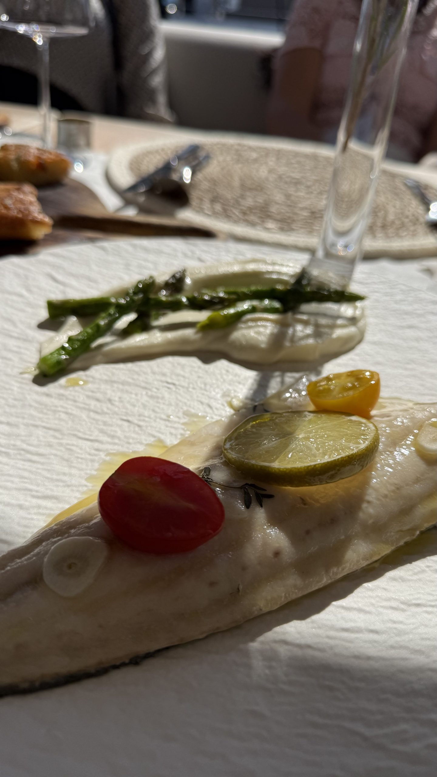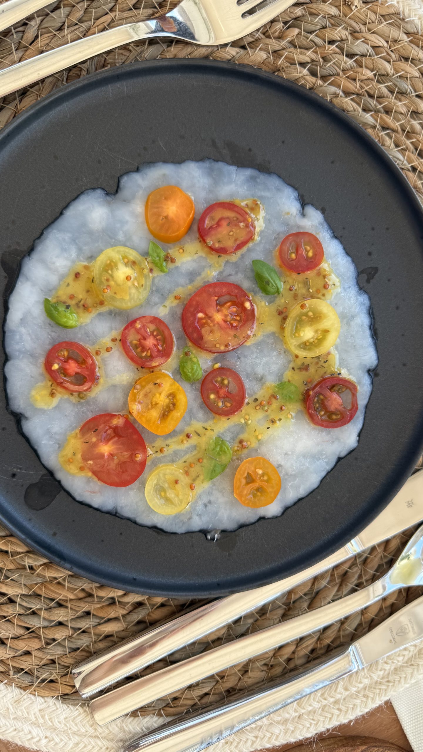 The first course was a beautifully delicate shrimp carpaccio, paired with tomatoes, basil and a subtle mustard note. Light, fresh, and perfectly balanced — elegant without trying too hard.