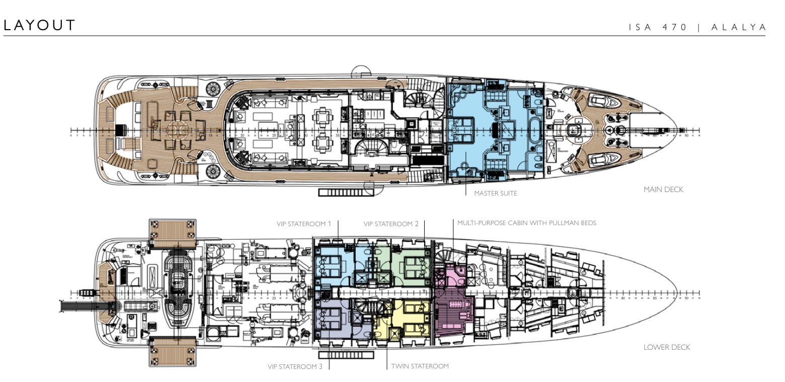 Alalya is a 47m motor yacht built in Italy in 2005 and refitted in 2020. She features 10 guest cabins comprising 4 Kings and 1 double with an additional multi-purpose cabin with pullman bunks, ideal for a Nanny or other staff. Therefore accommodating up to 12 guests.