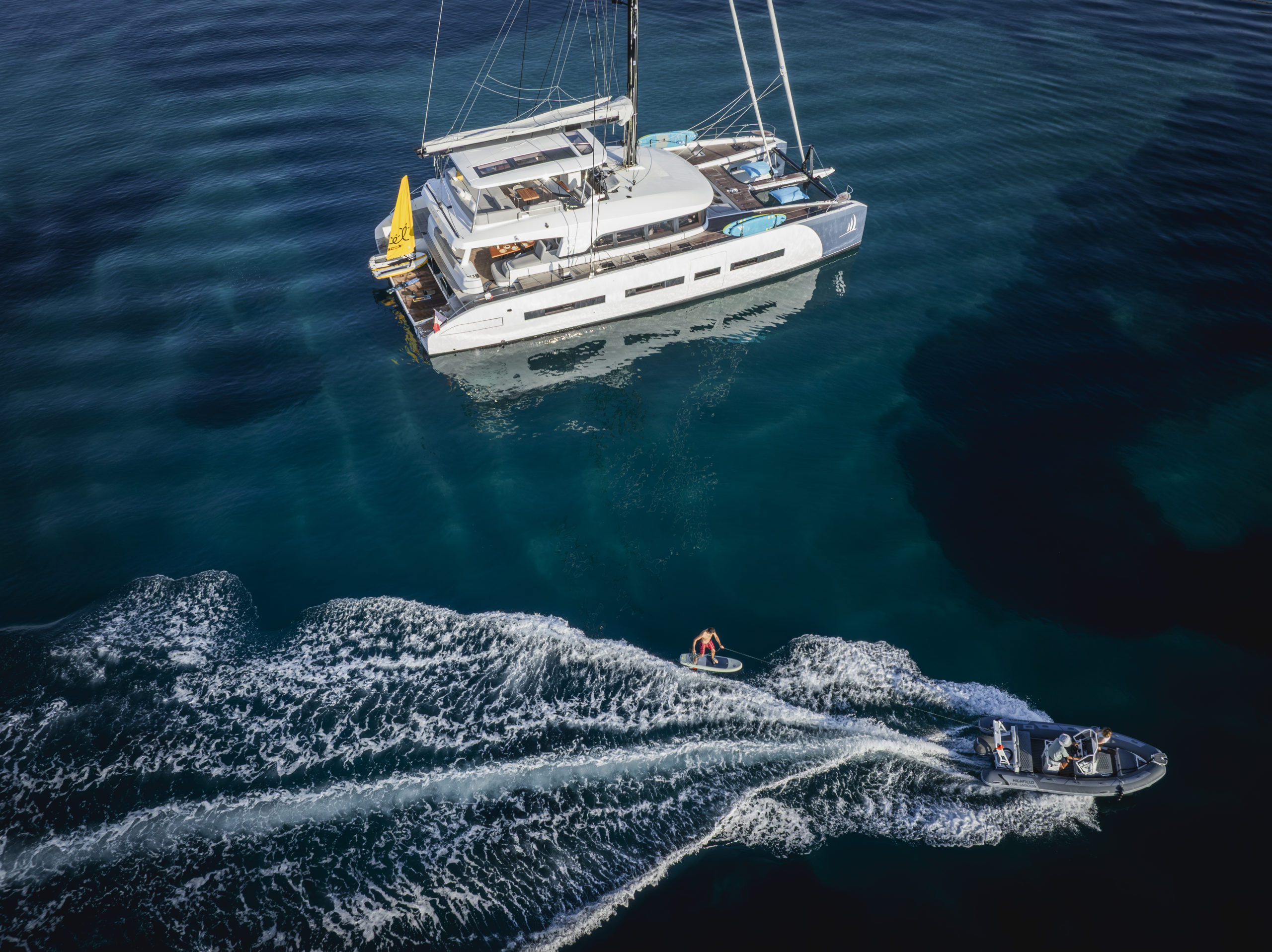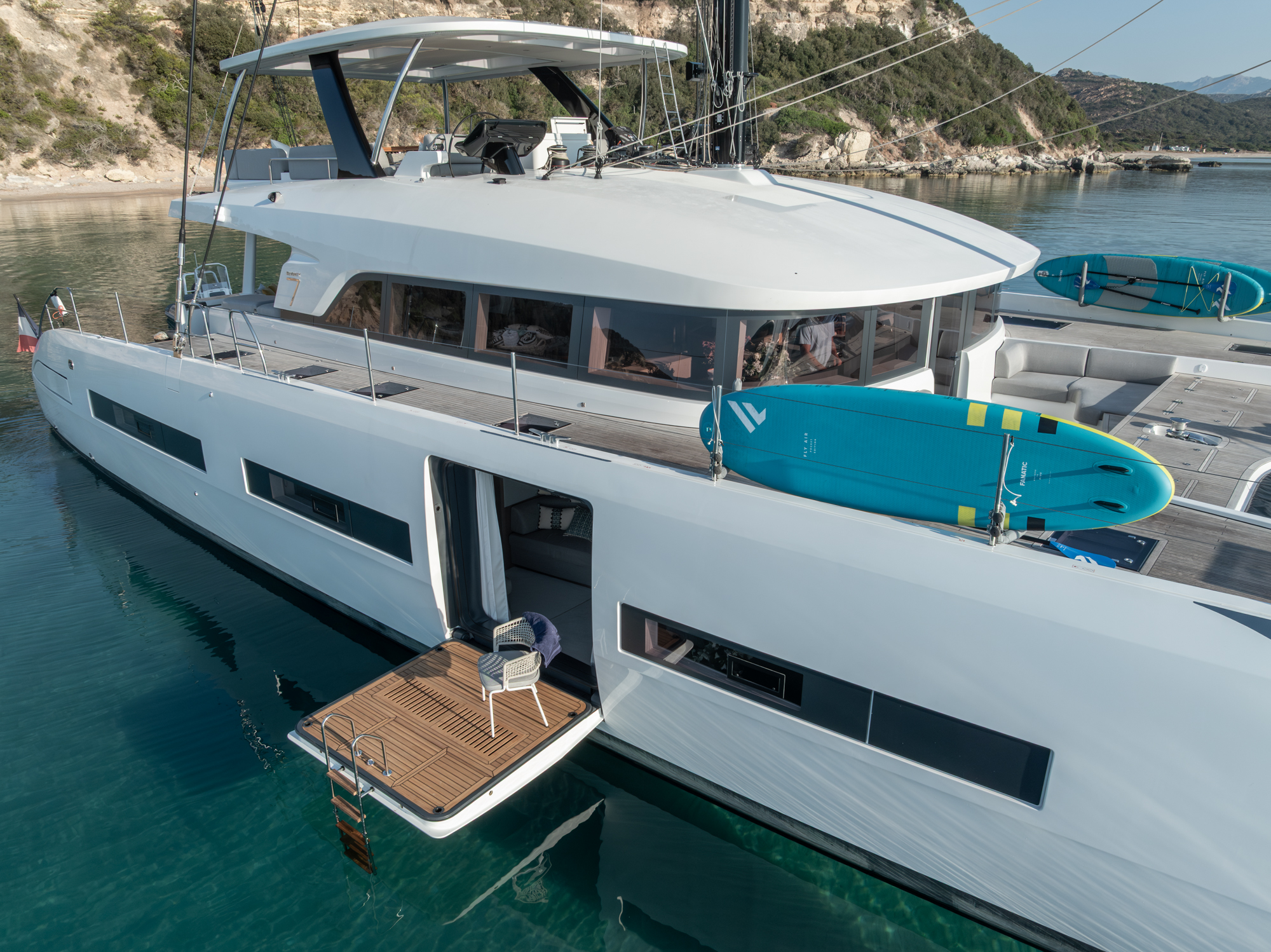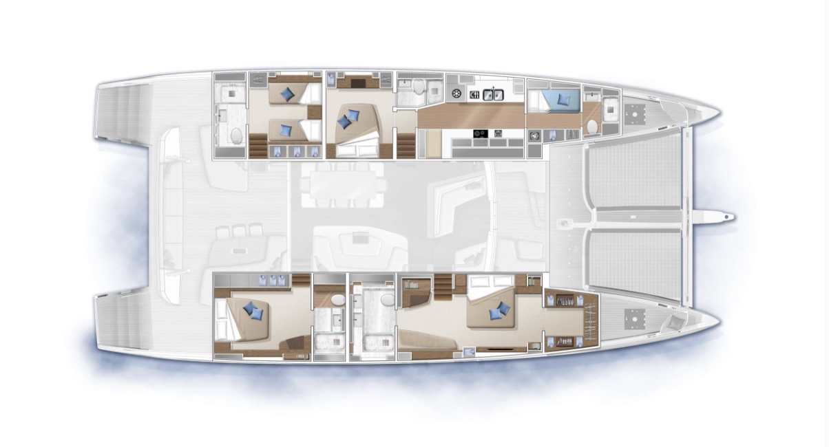 La Désirade is a 2025 build Lagoon 77 spending her first winter season in the Caribbean before returning to the Med next summer. She boasts 4 cabins, 3 doubles and 1 twin with a pullman bunk accommodating up to 9 guests. Each cabin is equipped with A/C and en-suite bathrooms. The master cabin is especially spacious with a private balcony and walk in wardrobe. Galley is down allowing for more guest spaces for relaxation.