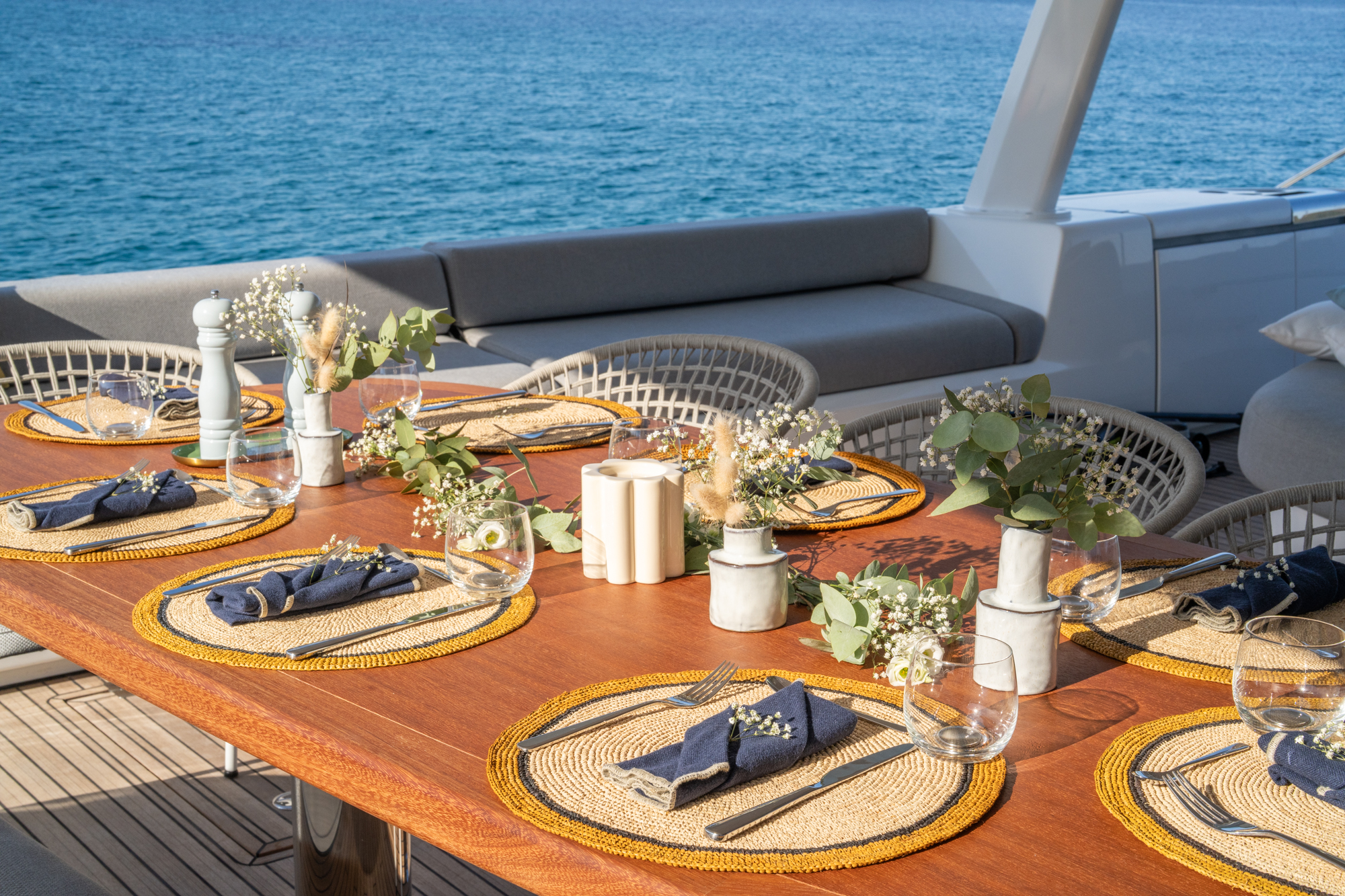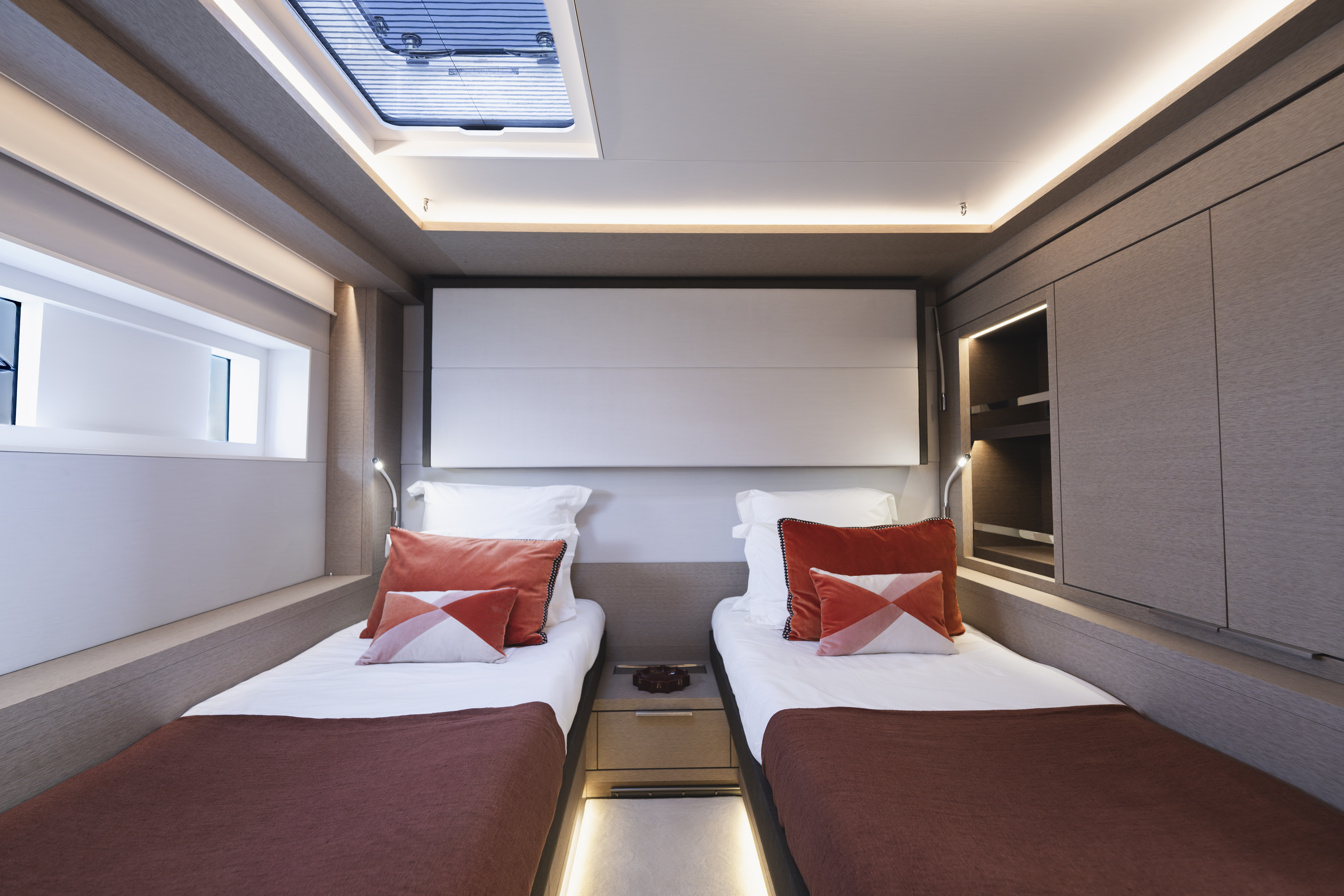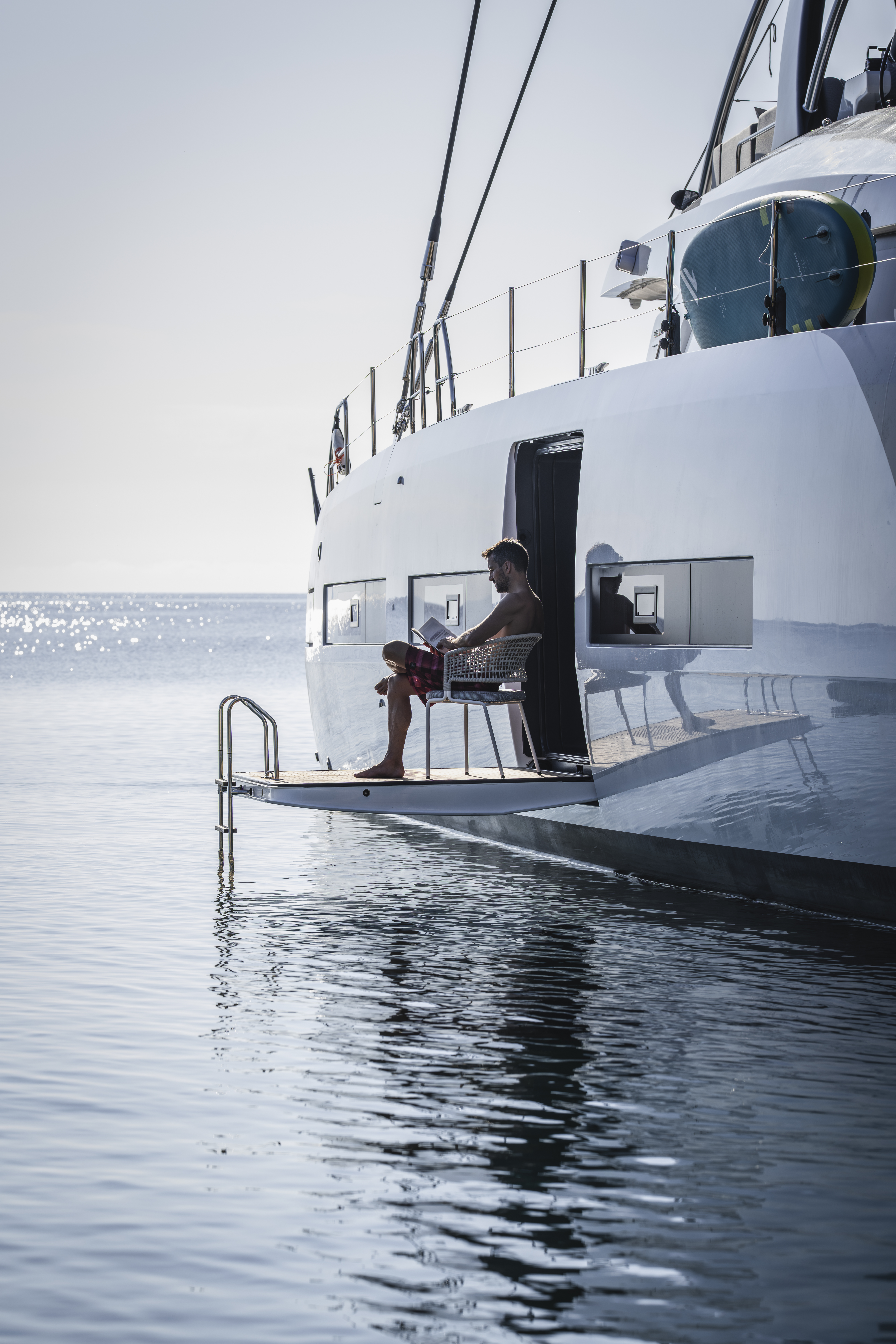 La Désirade is a 2025 build Lagoon 77 spending her first winter season in the Caribbean before returning to the Med next summer. She boasts 4 cabins, 3 doubles and 1 twin with a pullman bunk accommodating up to 9 guests. Each cabin is equipped with A/C and en-suite bathrooms. The master cabin is especially spacious with a private balcony and walk in wardrobe. Galley is down allowing for more guest spaces for relaxation.