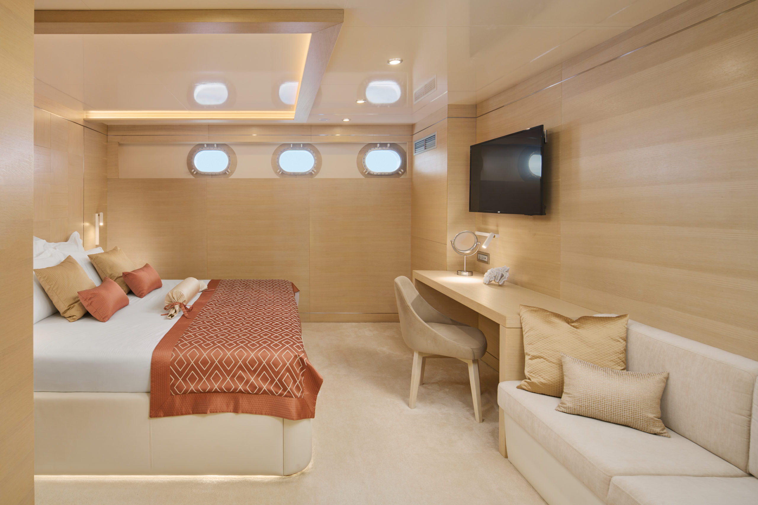 The guest accommodation comprises 5 cabins, 2 King size masters, 2 Queen cabins and 2 triple cabins each with en-suite and ample storage.