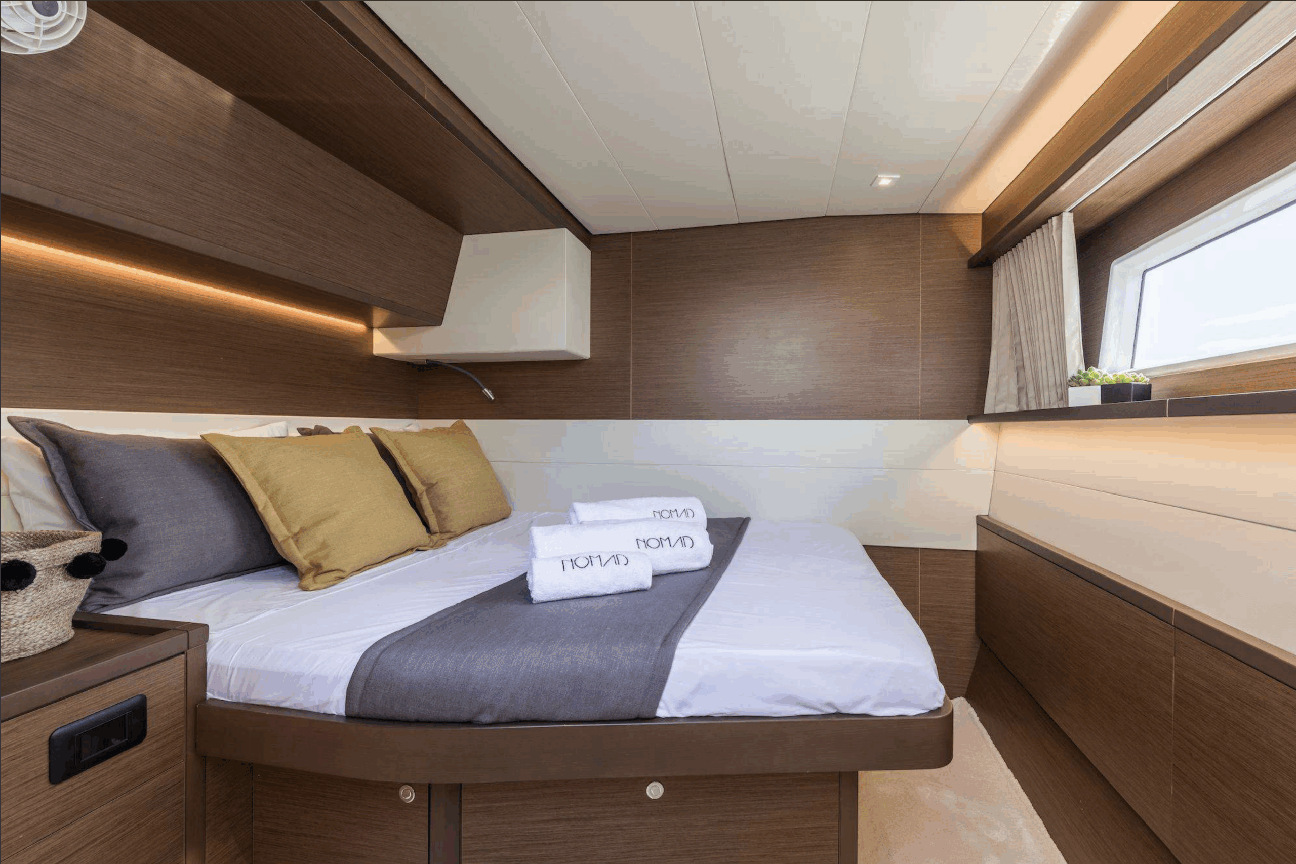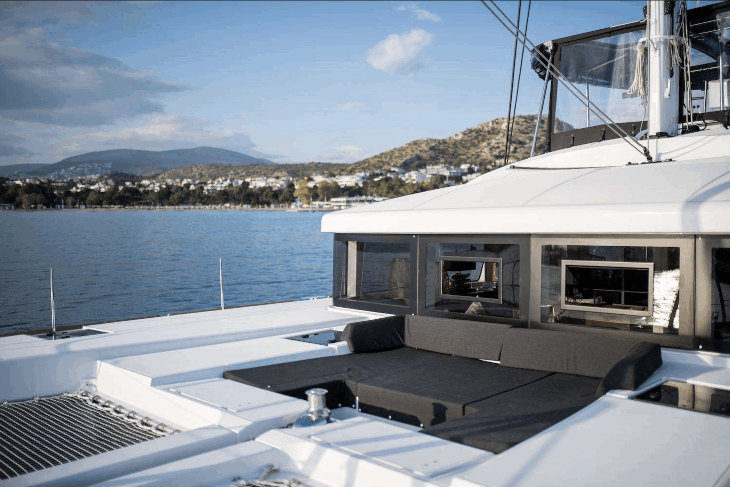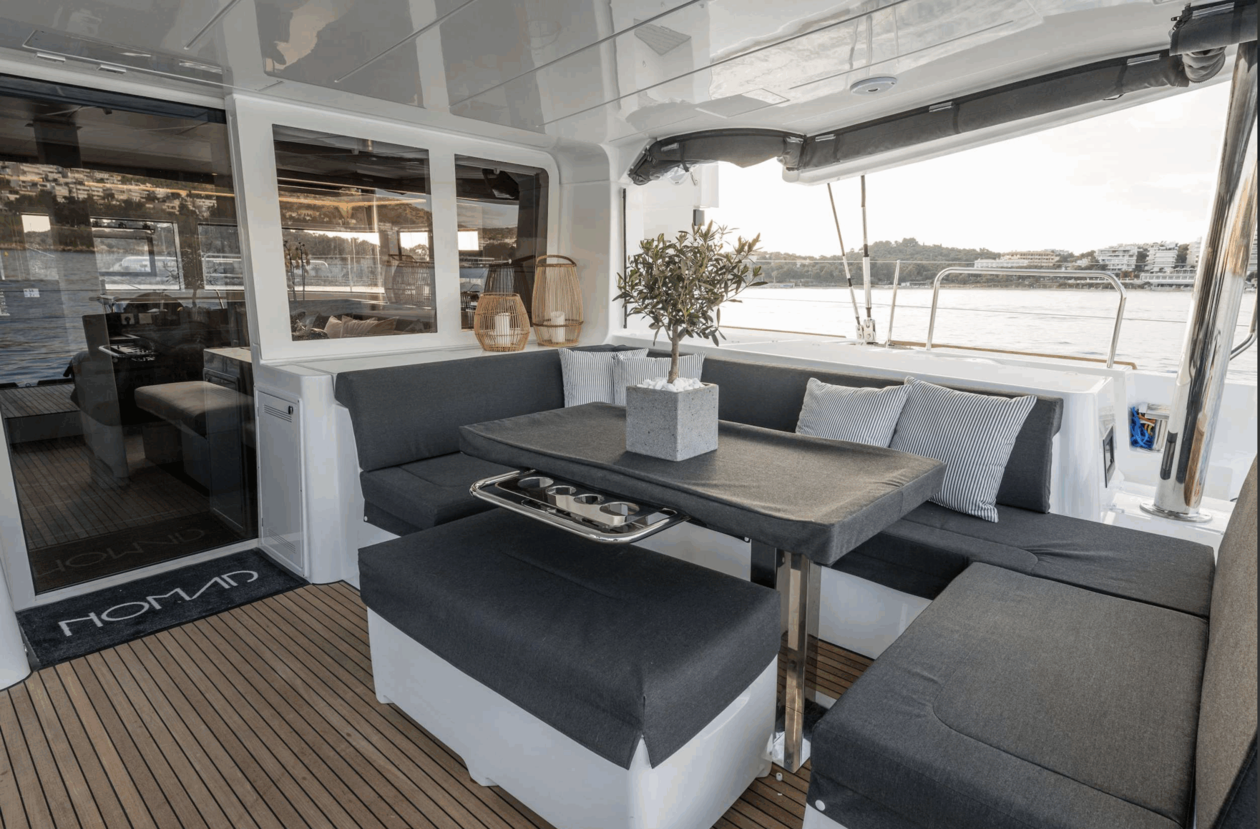 S/Y NOMAD is a 2019 built Lagoon 52 with some interesting technical upgrades such as a bench next to the dinghy as well additional storage areas and seating.