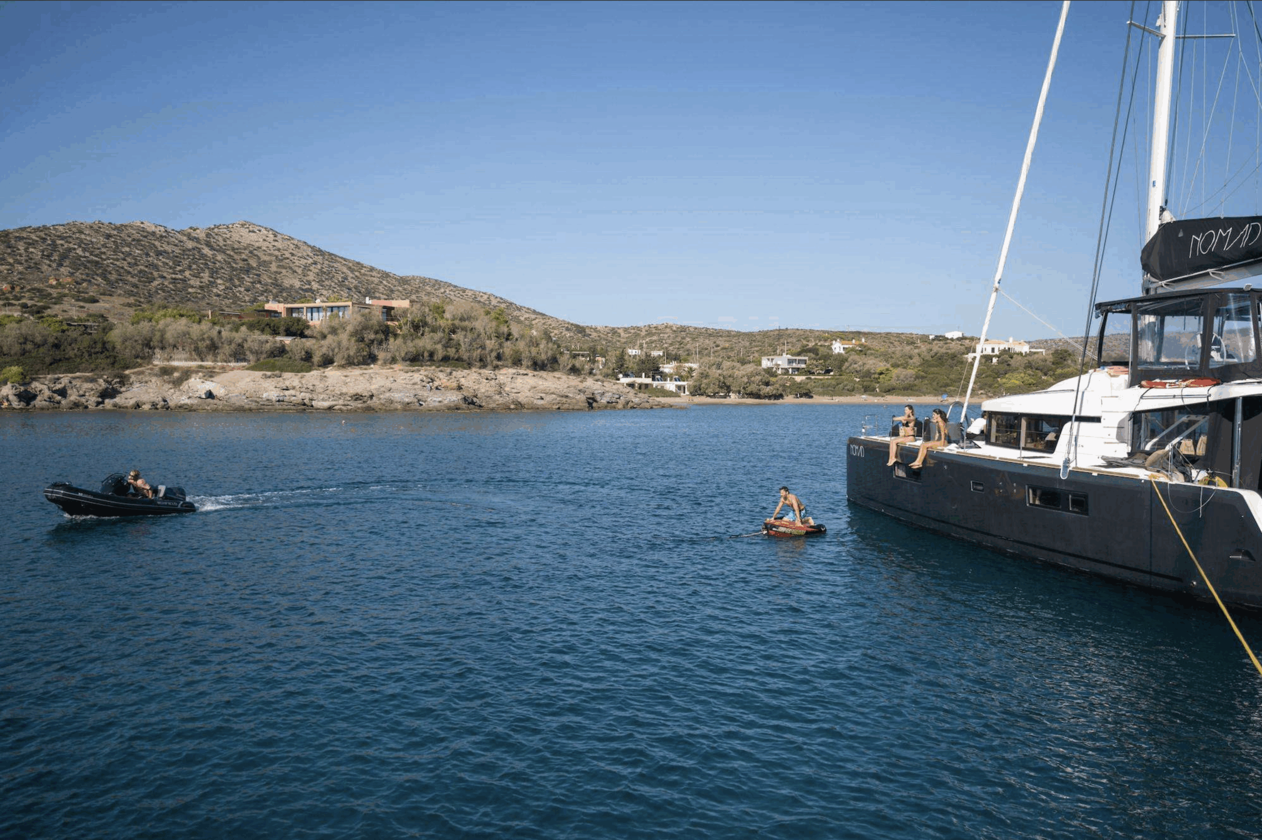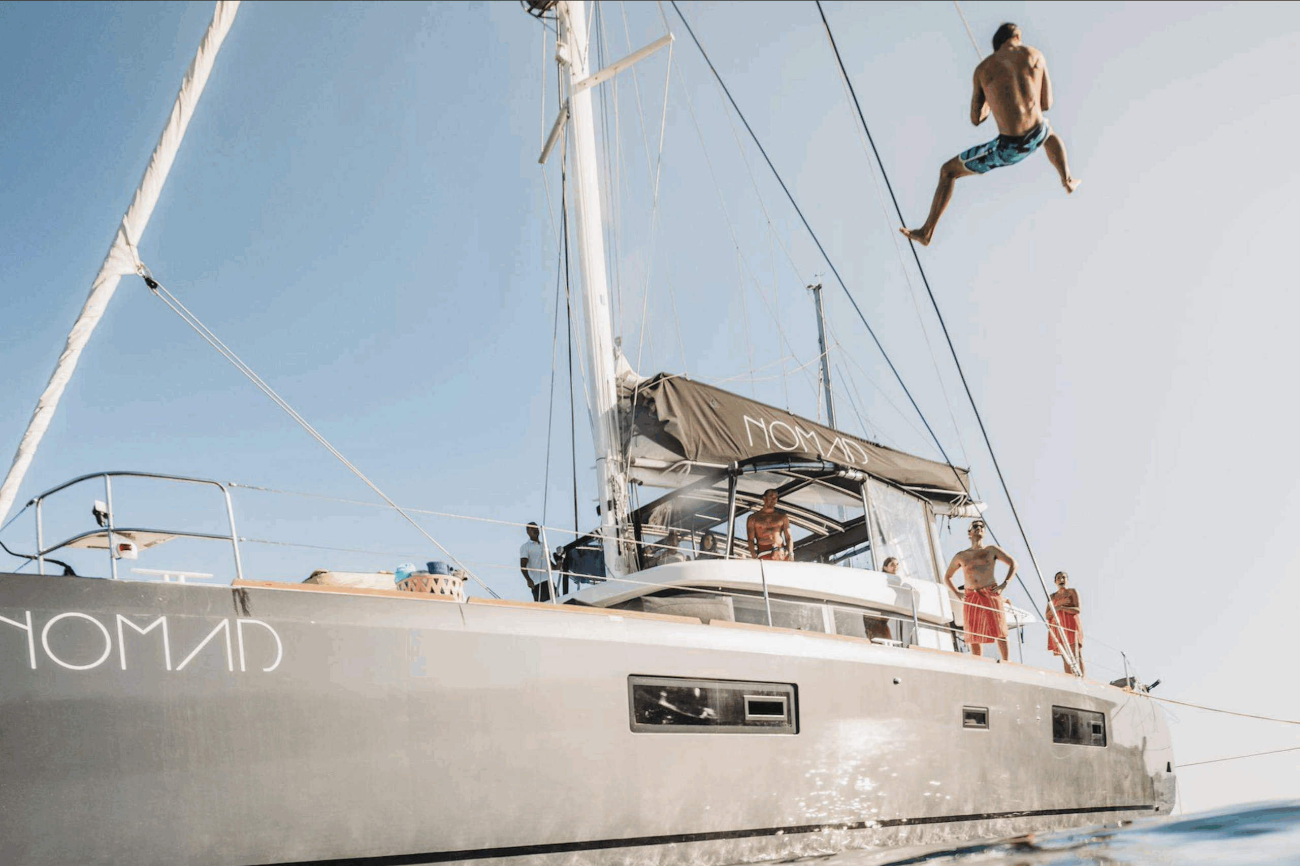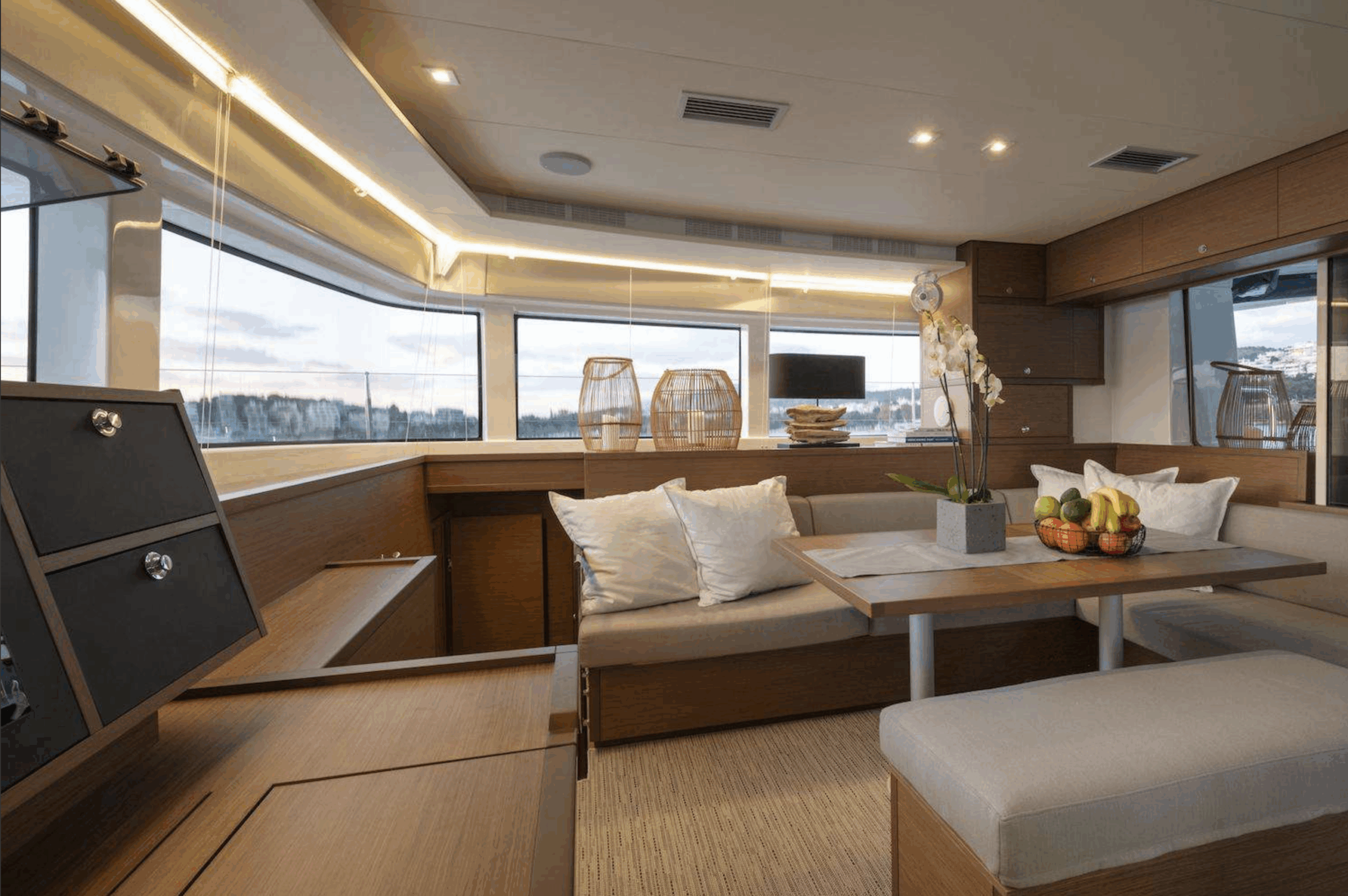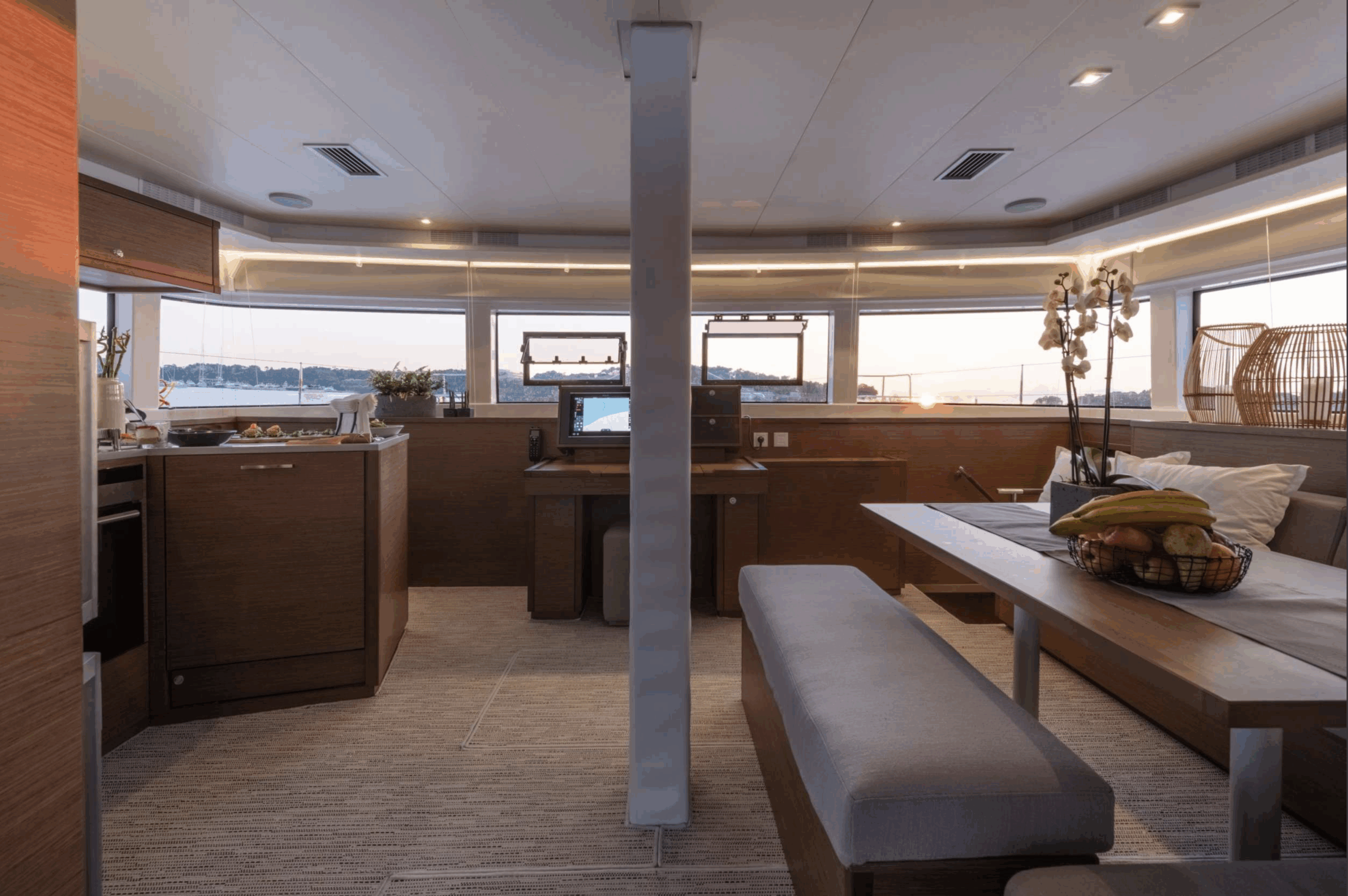 S/Y NOMAD is a 2019 built Lagoon 52 with some interesting technical upgrades such as a bench next to the dinghy as well additional storage areas and seating.